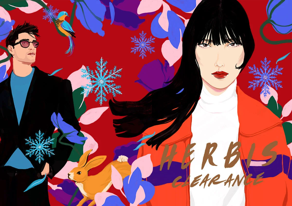 New York based illustrator Spiros Halaris created the winter clearance campaign visuals for HERBIS winter in Umeda, Osaka.