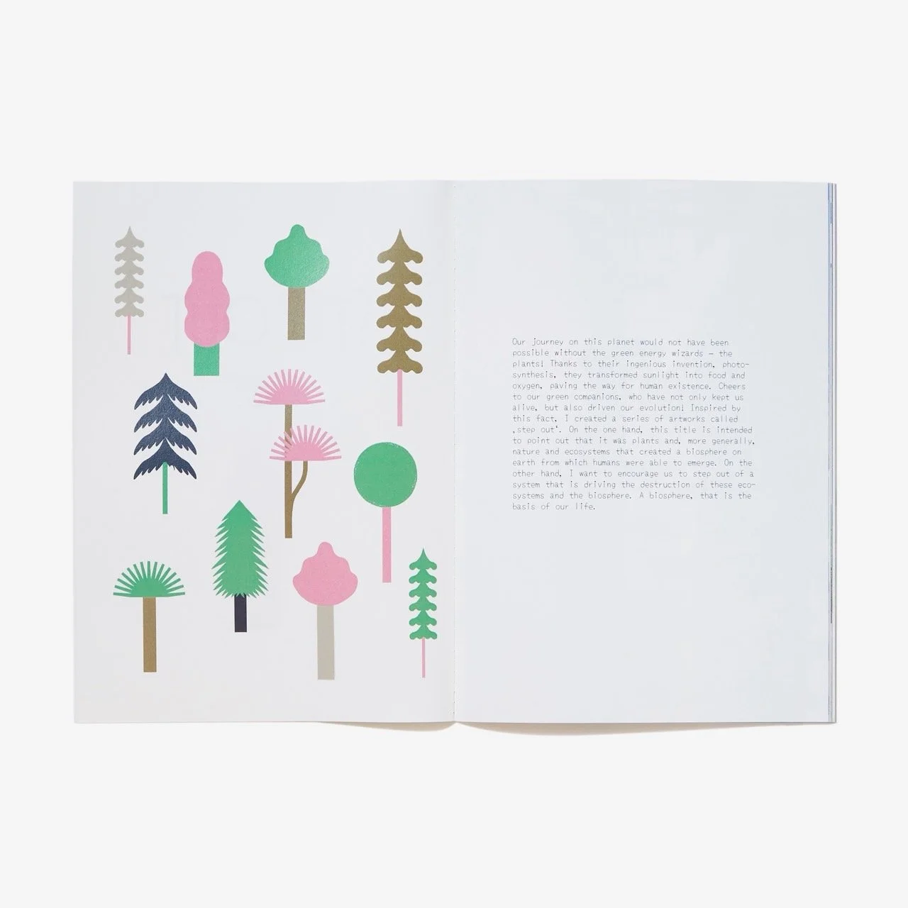 キャロライン・ロバートは私達人間と植物エネルギーとの魅惑的な相互関係に触発され、最新の作品集「STEP OUT」を発表しました。このタイトルには2つの意味が込められています。一つは、植物そして自然全体が人類が生存する上での生物圏を創造する上で重要な役割を果たしている点。一方で、こうした私たちの存在の基盤である生態系や生物圏の破壊を加速させているシステムから私達が一歩踏み出すよう、私たち人類へ呼びかけたいと考えました。